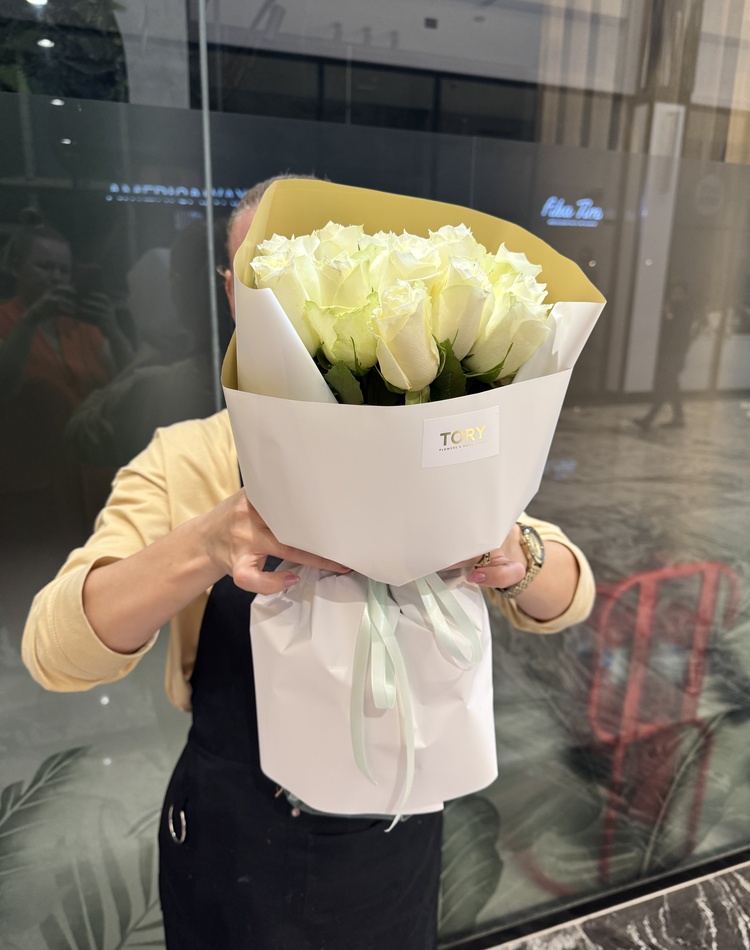 Composition: White Rose - 15, packing - 1, ribbon - 1