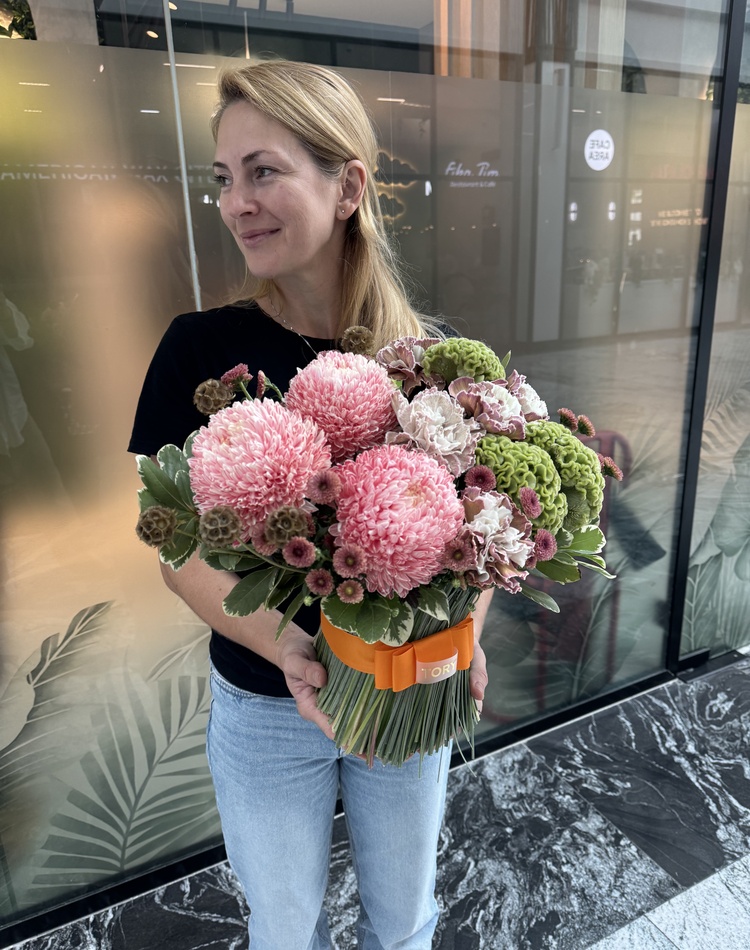 Composition: Bergras - 3, Chrysanthemum - 3, Celosia - 3, Dianthus - 7, Pittosporum - 2, Chrysanthemum spray - 6, Scabious - 5