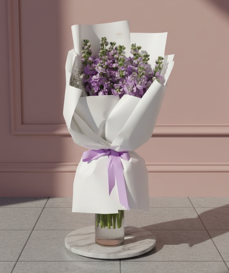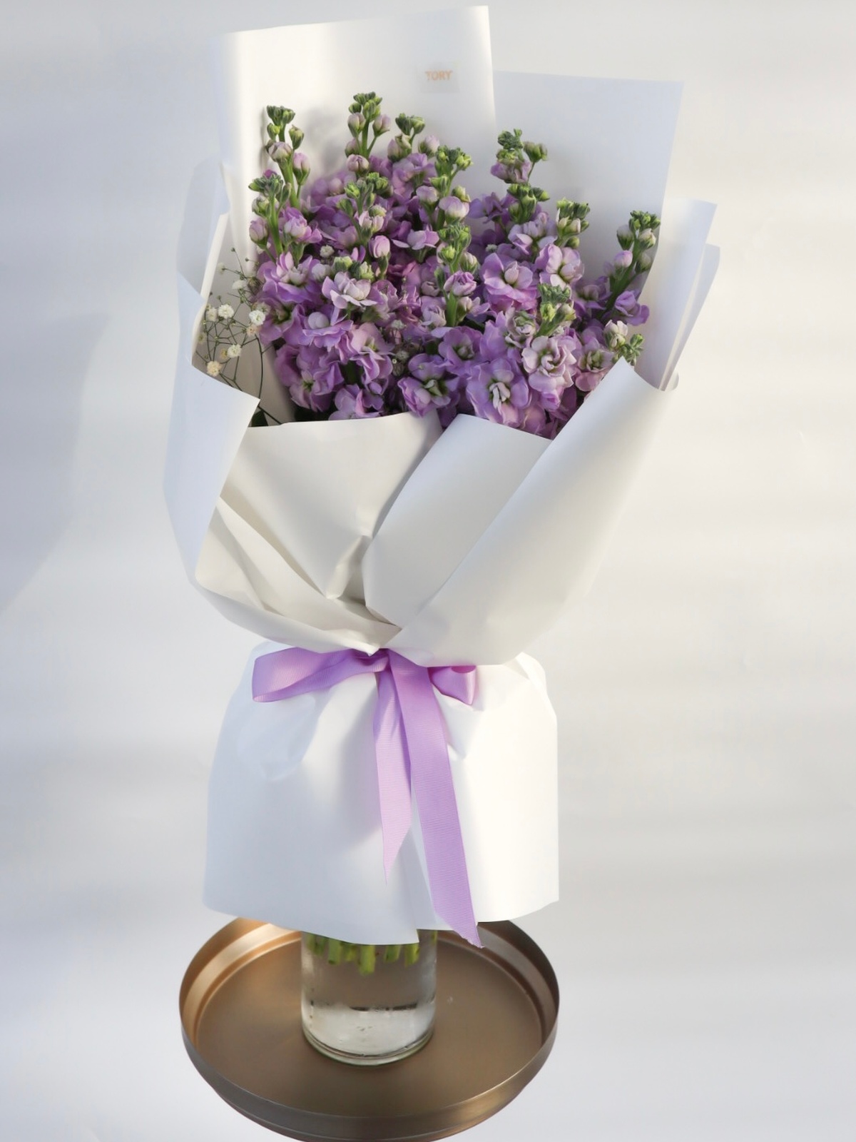 Composition: Mattiola - 15, Gypsophila - 2, Wrapping - 1, ribbon - 1